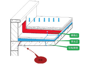 一般情況下,產生滲漏的三個條件分別是:防水層的“薄弱點”、防水層與主體混凝土結構層之間存在“竄水層”、混凝土結構板存在“結構裂縫”,這種情況下,防水系統存在滲漏率高,防水維修困難的特點。在防水層無法做到“天衣無縫”、混凝土結構也無法完全避免產生裂縫的情況下,要解決滲漏問題,消除“竄水層”是最為有效的方式。