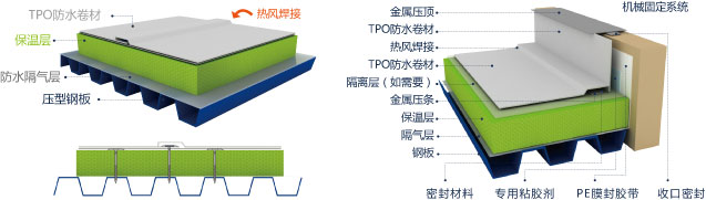 凱倫TPO防水卷材屋面系統一般采用機械固定。即TPO防水卷材鋪設于基層(或已被固定的保溫板),在相鄰的下層卷材搭接區,用機械緊固螺釘和固定墊片與基層固定,上層卷材與下層卷材的搭接采用熱空氣焊熔接,使卷材連接成一個整體密封的防水層。根據工程需要接縫外邊緣用密封膏封嚴。